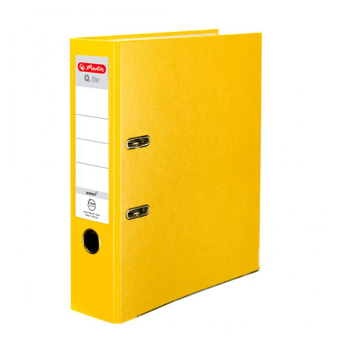 Pákový zakladač Q.file protect formátu A4. Šírka chrbta 8cm. Materiál polypropylén, zásuvné vrecko, vnútorný biely podlep, lepenka 2mm, otvor na zadnej strane a radokrúžok pre lepšiu manipuláciu, kovová lišta. Farba žltá. Väčšie balenie 20 ks.