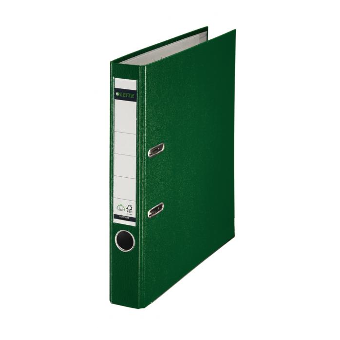 Patentovaný pákový celoplastový zakladač formátu A4 vyrobený z kvalitného kartónu. Vonkajšia strana potiahnutá farebnou polypropylénovou fóliou, vnútorná svetlosivou fóliou. Zakladač je vybavený vysokokvalitnou mechanikou Leitz, chrbtovým krúžkom, kovovou lištou a vymeniteľným papierovým štítkom na popis. Vysokokvalitná mechanika umožňuje o 50 % širšie otvorenie zakladača než dovoľuje bežná páková mechanika, čo znamená až 20 % úspory času pri manipulácii a archivácii dokumentov. Šírka chrbta 5,2 cm. Väčšie balenie 10 ks. Farba zelená.