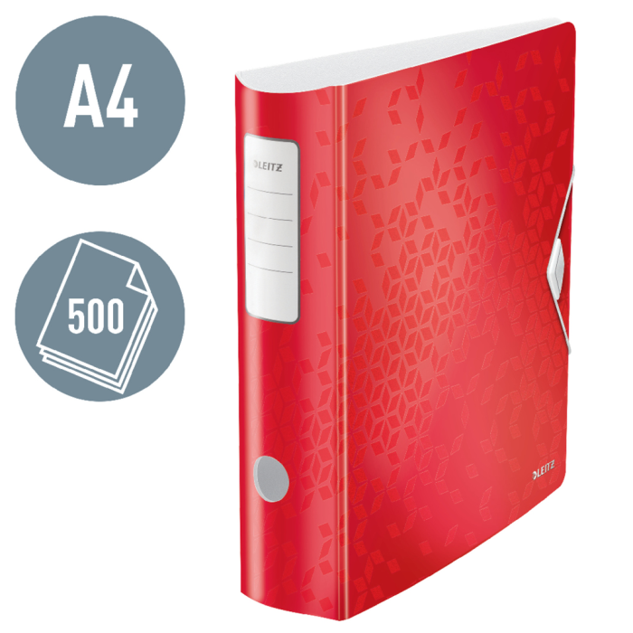 Inovatívny mobilný zakladač v žiarivej WOW farbe s dvojfarebným efektom. Dvojvrstvový PP materiál vyplnený penou z tzv. Polyfoamu, ktorý je extrémne odolný a ľahký. Unikátna páková mechanika s otvorením o 180 °, ktorá umožňuje o 50 % širšie otvorenie a o 20 % rýchlejšiu prácu s zakladačom. Praktické uzatváranie na gumičku pre bezpečný prenos. Vnútorný obal na voľné papiere, CD/DVD a vizitky. Zaoblený chrbát a praktická úchytka na pero pre pohodlné mobilné použitie. Šírka chrbta 8,2 cm, kapacita 500 listov A4 (80 g/m²). Farba červená.