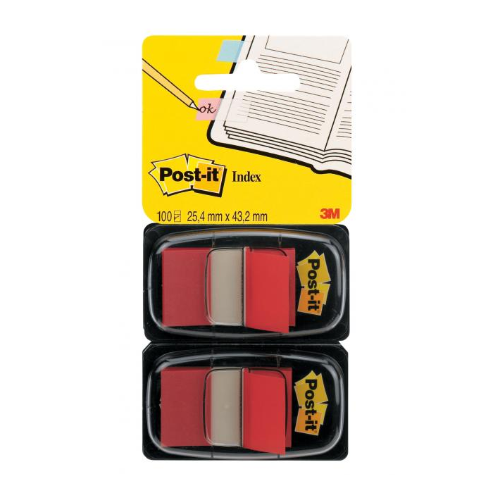 Široké acetátové záložky do kníh, časopisov, ako register do cenníkov, katalógov, kartoték, zakladačov, archívov a pod. Priehľadná lepiaca časť a farebná časť na označenie. Prelepiteľné, znovunalepiteľné a popisovateľné. Rozmery záložky 25,4×43,2 mm. Balenie 2×50 lístkov. Farba červená.