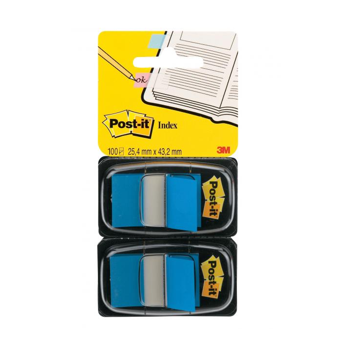 Široké acetátové záložky do kníh, časopisov, ako register do cenníkov, katalógov, kartoték, zakladačov, archívov a pod. Priehľadná lepiaca časť a farebná časť na označenie. Prelepiteľné, znovunalepiteľné a popisovateľné. Rozmery záložky 25,4×43,2 mm. Balenie 2×50 lístkov. Farba modrá.
