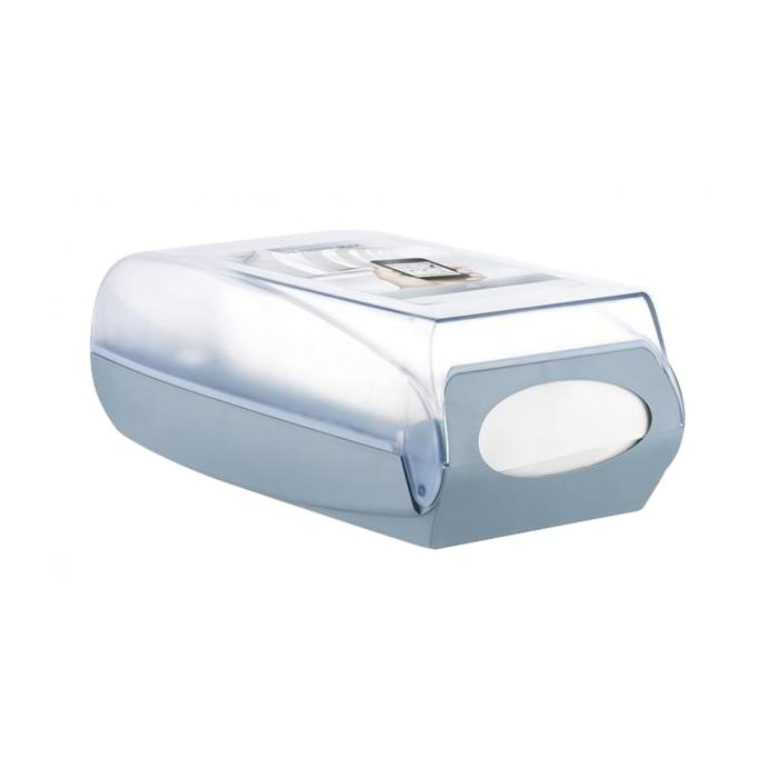 Zásobník HARMONY Professional na skladané servítky na stôl / stenu. Voľne stojaci alebo s možnosťou upevnenia na stenu. Materiál ABS plast. Plocha s pružinou, ktorá servítky posúva k otvoru na vyťahovanie. Uzamykateľný západkou. Kapacita 500 servítkov. Farba číra, kryt a podstavec tyrkysový.