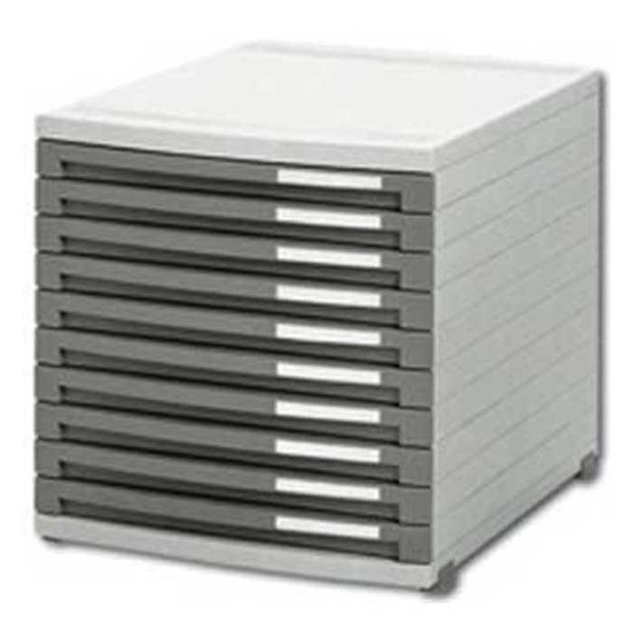 Box z modulárneho systému zásuvkových boxov s horizontálnym aj vertikálnym spájaním. Model so zatvorenými zásuvkami (bez predného krytu) výšky 25 mm a zarážkou chrániacou zásuvky pred úplným vysunutím. Súčasťou sú identifikačné menovky na označenie zásuviek.Telo boxov vo svetlosivej farbe, zásuvky tmavosivé. Rozmery (š × v × h) 30 × 30,7 × 38,2 cm.