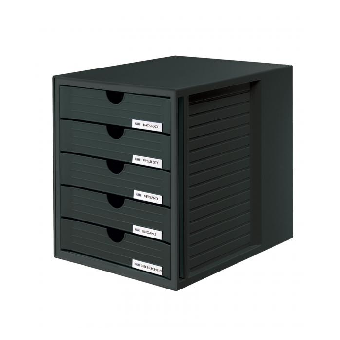 Plastový zásuvkový box s piatimi zatvorenými zásuvkami. Zmestí sa do ľubovoľnej police určenej pre zakladače, pretože výška boxu je totožná s výškou pákových zakladačov (275 × 330 × 320 mm).