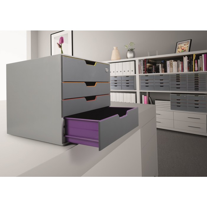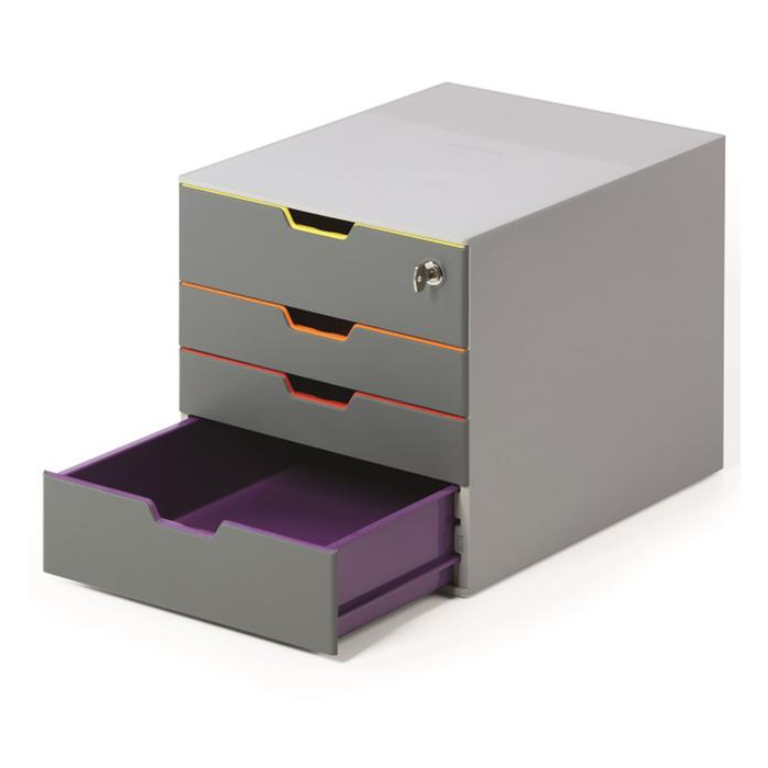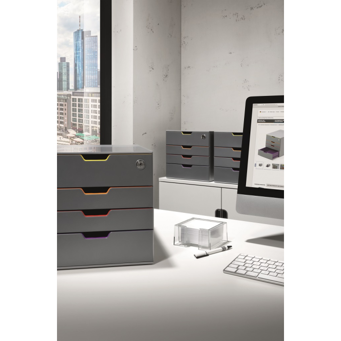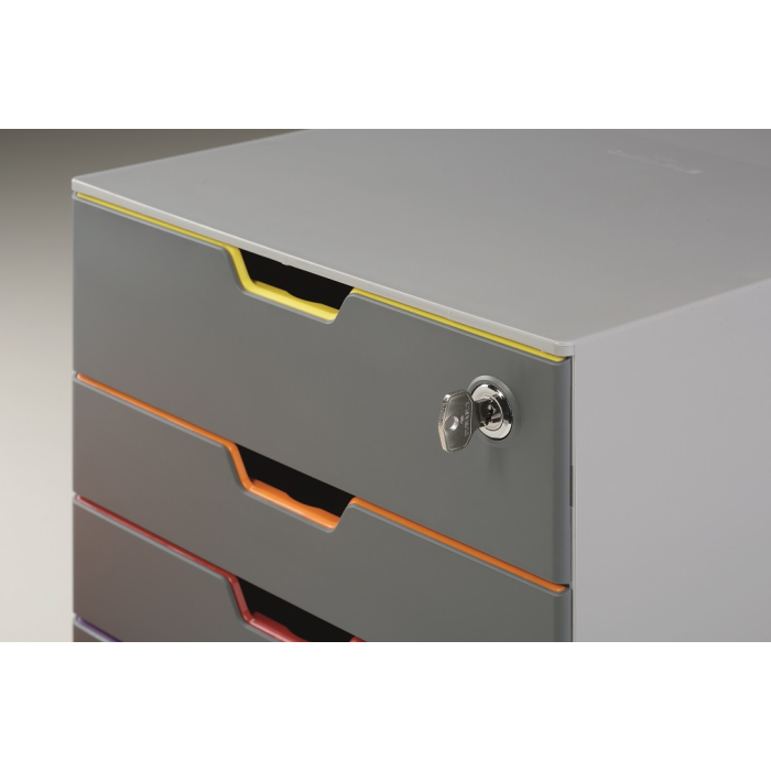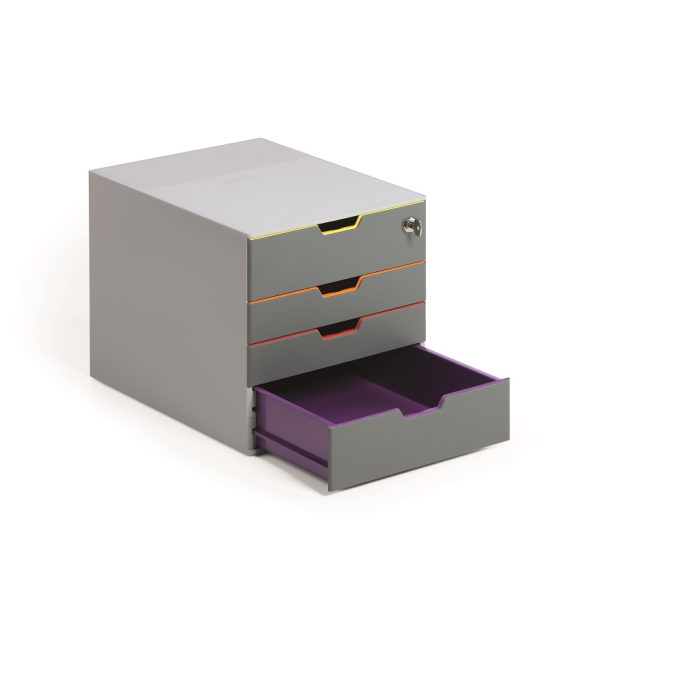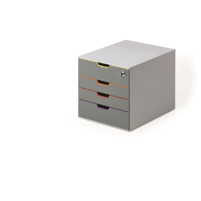 Box s cylindrickou vložkou, dodávaný s 2 kľúčami. 4 zatvorené zásuvky, vrchná a spodná zásuvka vo formáte XXL.