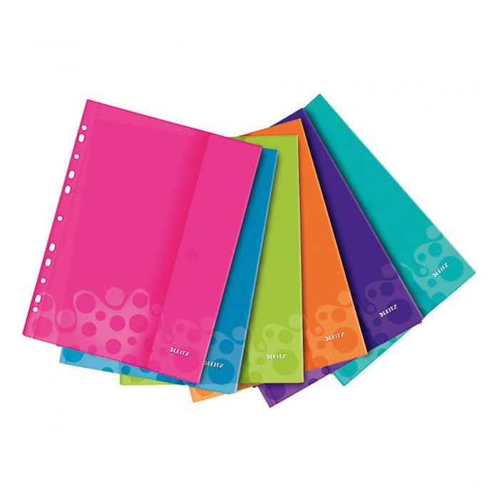 Obaly na dokumenty formátu A4 s uzatváraním na suchý zips a multiperforáciou na zakladanie do zakladačov. V dizajne radu Leitz WOW. Kapacita 50 listov papiera formátu A4. Balenie 6 ks v mixe farieb (ľadová modrá, metalická modrá, metalická oranžová, metalická zelená, metalická ružová a purpurová). Formát A4.