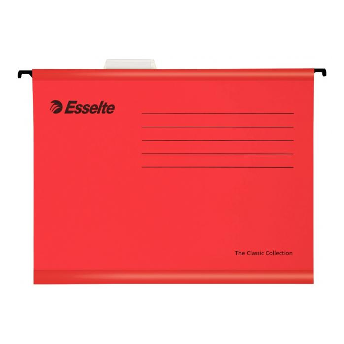 Závesné obaly Esselte kolekcie Classic vyrobené z pevného kartónu. Lisované dno obalu dovoľuje zvýšiť kapacitu na 30 mm. Súčasťou obalu je násuvný index z priehľadného plastu s výmenným papierovým štítkom. Formát A4, rozpätie vodiacich líšt 330 mm.
