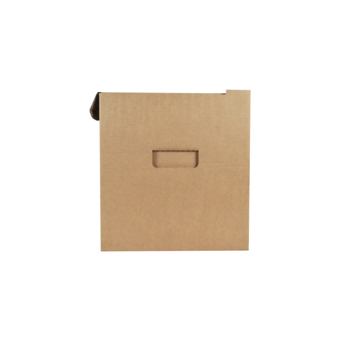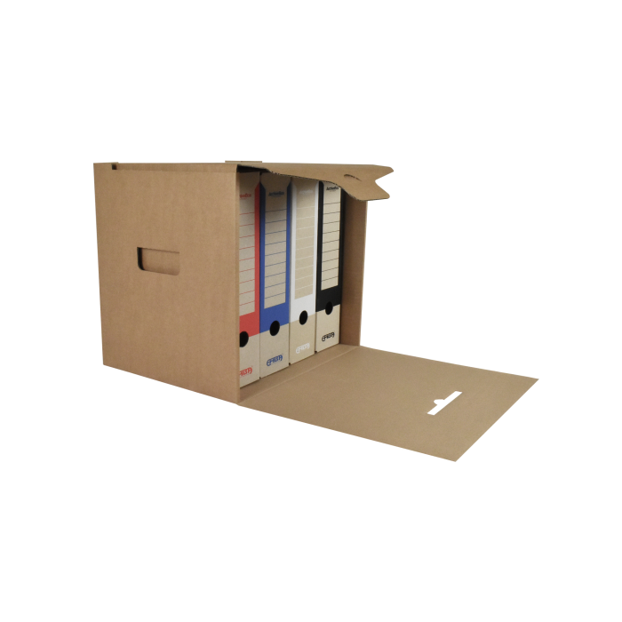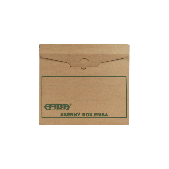 Box na uskladnenie 4 zakladačov so šírkou chrbta 7,5 - 8 cm. Vyrobený z kvalitnej trojvrstvovej vlnitej lepenky H/ H so zelenou potlačou. Konštrukcia boxu je spevnená zosilnením bočných stien. Umožňuje uloženie 4 skupinových boxov na seba, čím nahrádza kovový regál na miestach, kde ho z priestorového hľadiska nie je vhodné umiestniť.