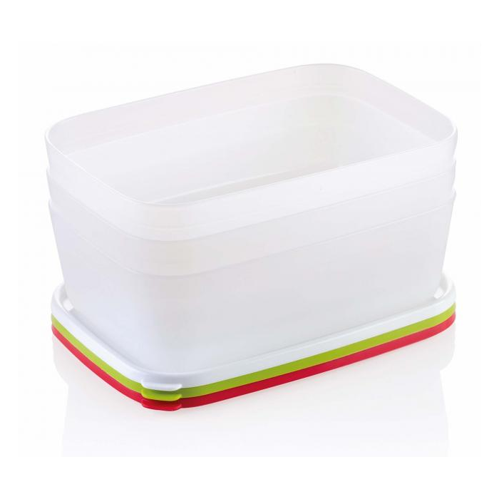 Dózy vyrobené zo špičkového plastového materiálu určeného pre zdravotníctvo a farmáciu, vynikajúce pre hygienické uloženie potravín v mrazničke alebo chladničke. Použitý materiál je neutrálny, neovplyvňuje kvalitu pokrmov ani pri dlhodobom zmrazení a skladovaní. Sú elastické, ľahko sa otvárajú aj zatvárajú a dokonale tesnia. Vybavené farebnými viečkami pre ľahké rozlíšenie pri oddelenom skladovaní mäsa, zeleniny, ovocia a pod., stohovateľné na seba aj do seba pre úsporu miesta. Vhodné do mrazničky, chladničky, mikrovlnnej rúry a do umývačky. Balenie 3 ks. Objem 1,5 litra. 3 roky záruka.