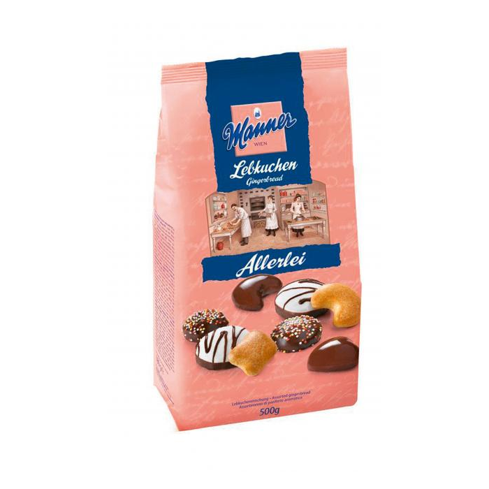 Pestrá zmes rôznych perníkov Manner. Niektoré perníky sú pokryté tmavou čokoládou, perník s mliečnou čokoládou, ďalšou polevou alebo posypané ozdobnými guľôčkami. Veľké balenie obsahuje pol kilogramu perníka od Mannera. Hmotnosť 500 g.