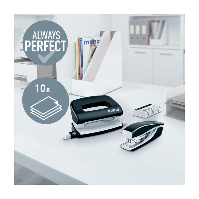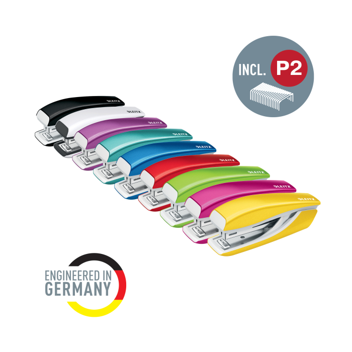 Malá zošívačka v moderných žiarivých farbách ideálna nielen do kancelárie, ale aj domov alebo na cesty. Vždy perfektné zošitie vďaka patentovanej technológii DIT. V kombinácii so spinkami Leitz Power Performance P2 (č. 10) dosiahnete vždy jednoduché a správne zošitie.Kapacita 10 hárkov. Vrecková zošívačka. Patentovaná technológia DIT na spoľahlivé zošívanie. Balenie v škatuľke, vrátane spiniek. Otvorením ramena o 180° je možné použiť nástenkové zošívanie (takrovanie). Farba čierna.