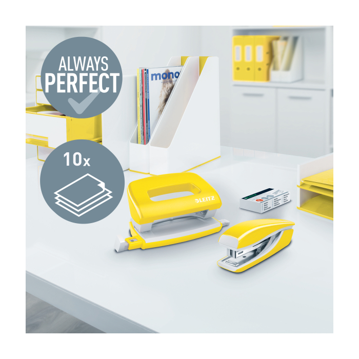 Malá zošívačka v moderných žiarivých farbách ideálna nielen do kancelárie, ale aj domov alebo na cesty. Vždy perfektné zošitie vďaka patentovanej technológii DIT. V kombinácii so spinkamii Leitz Power Performance P2 (č. 10) dosiahnete vždy jednoduché a správne zošitie.Kapacita 10 hárkov. Vrecková zošívačka. Patentovaná technológia DIT na spoľahlivé zošívanie. Balenie v škatuľke, vrátane spiniek. Otvorením ramena o 180° je možné použiť nástenkové zošívanie (takrovanie). Farba žltá.