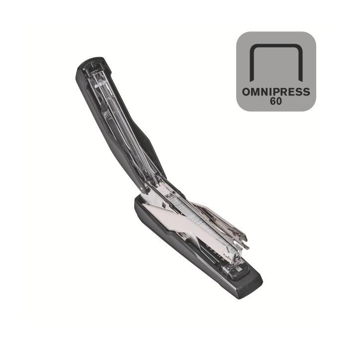 Revolučná zošívačka kompaktných rozmerov a s klasickou kapacitou zásobníka, vybavená patentovanou technológiou Omnipress®, ktorá umožňuje s minimom sily stlačiť zošívačku po celom jej tele a ľahko tak zošiť dokument na stole i v ruke. To všetko v kombinácii s technológiou super plochého zošívania SuperFlatClinch prinášajúcou 40 % úsporu miesta pri zakladaní takto zošitých dokumentov. Farba čierna/sivá.