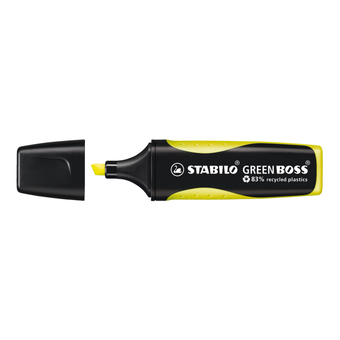 STABILO GREEN BOSS. Zvýrazňovač vyrobený z 83% recyklovaného plastu pre školákov, študentov, učiteľov a zamestnancov kancelárie, ktorí sú ohľaduplní k životnému prostrediu. Štýlový dizajn s protišmykovou zónou úchopu. Technológia STABILO Anti-Dry-Out chráni pred vysychaním po dobu 4 hodín a zaisťuje koncentrovanú prácu. Zvýrazňovač je možné ľahko a pohodlne doplniť náplňami STABILO BOSS ORIGINAL. Atrament na vodnej báze. 2 šírky stopy 2 + 5 mm. Farba žltá. Väčšie balenie 10 kusov.